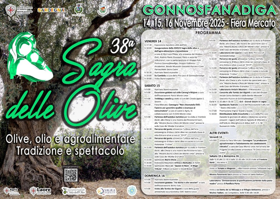 Gonnosfanadiga, 38^ sagra delle olive, olio e agroalimentare. 14,15 e 16 novembre 2025